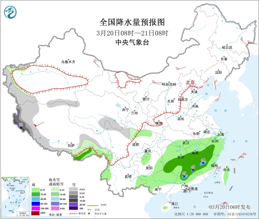 3月20日08时至21日08时,新疆南疆西部山区、西藏西部和南部、青海南部、川西高原北部等地部分地区有小到中雪或雨夹雪,其中,西藏西部等地部分地区有大到暴雪,局地大暴雪(20~25毫米)。贵州东部、江南大部、华南北部和西部、海南岛中部、台湾岛东部等地部分地区有小到中雨,其中,江西南部、福建西部、广东西北部等地部分地区有大雨(25~45毫米)。新疆东部、内蒙古中西部、黑龙江东部、辽东半岛、山东半岛等地部分地区有4~6级风,西藏南部部分地区有7~8级风;台湾海峡将有5~6级风、阵风7级。